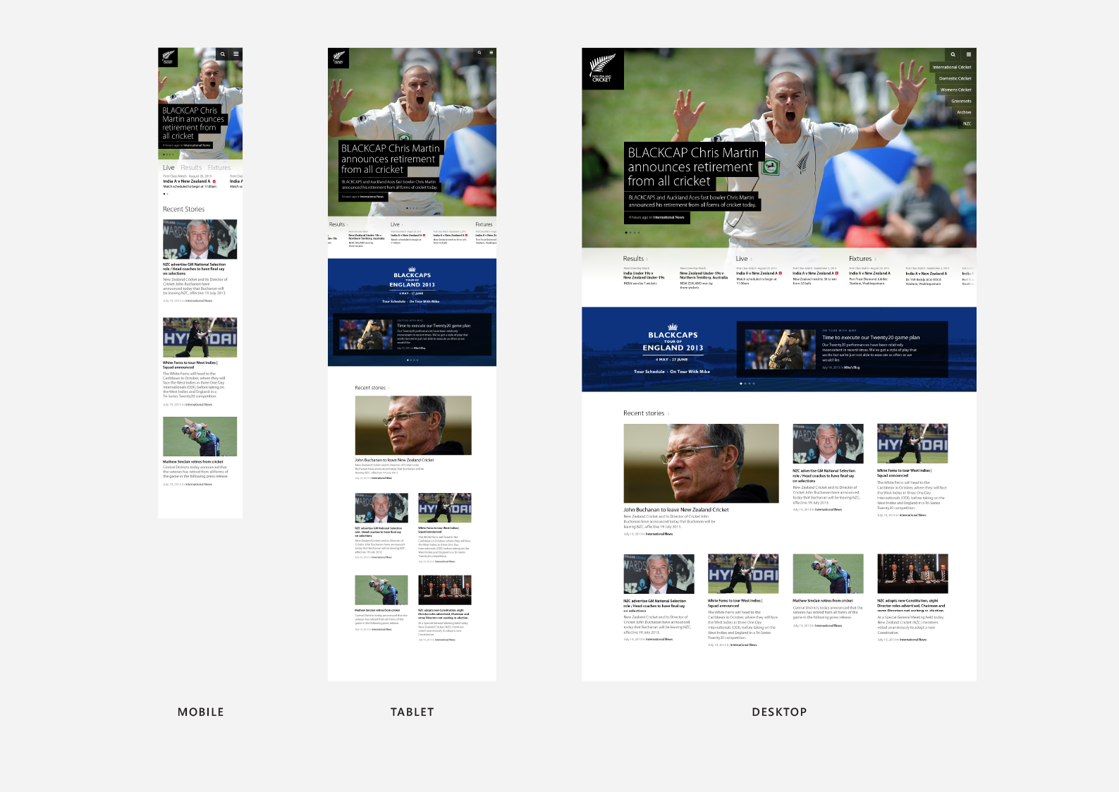A long-standing relationship with New Zealand Cricket involved designing multiple versions of their website, mobile apps, a live scoring platform and and even stadium scoreboards.